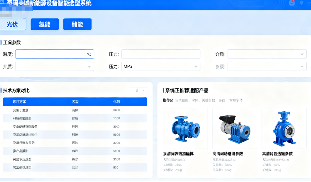 定制化選型服務開發 “新能源設備智能選型系統”,用戶輸入項目類型(光伏 / 氫能 / 儲能)、工況參數(溫度、壓力、介質)后,系統 30 秒內推薦適配產品,并提供技術方案對比;同時配備 20 人專業技術團隊,提供上門勘測與方案設計服務。