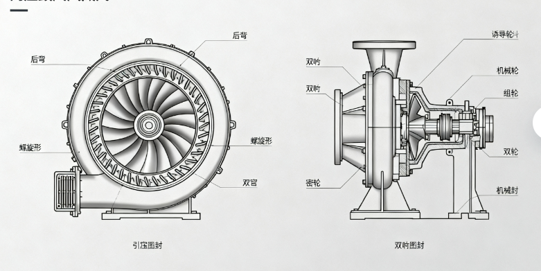 而泵主要用于輸送液體介質(如水、油、化工漿料等),液體密度大、不可壓縮,設計核心在于 “提升液體揚程與減少沿程阻力”。泵的葉輪葉片類型更豐富,根據輸送液體的黏度、含固量可選擇后彎式、徑向式或前彎式葉片 —— 例如輸送清水等低黏度液體常用后彎式葉片(效率高、噪音低),輸送高黏度液體或漿料則可能采用徑向式葉片(抗堵塞、推力小);泵的流道設計更注重 “密封性” 與 “防氣蝕”,葉輪進口處會設置誘導輪或采用雙吸式結構,減少液體進入葉輪時的真空度,避免因氣蝕導致葉輪損壞;機殼同樣為蝸殼形,但流道截面積變化更平緩,且內部會設置耐磨環(與葉輪間隙配合),防止液體泄漏與磨損。